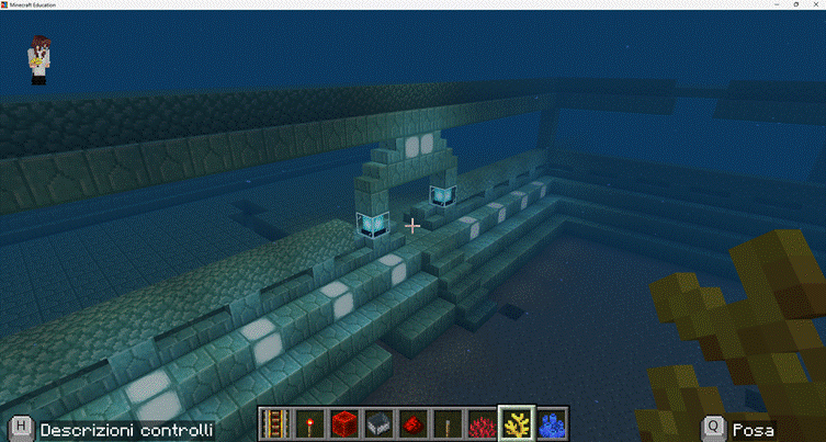 Foto2. Tempio atlantideo costruito sott’acqua. Elaborata costruzione subacquea in Minecraft Education realizzata dagli allievi nel corso del progetto che raffigura un tempio atlantideo, frutto di un’attività di progettazione creativa che unisce immaginazione, architettura e concetti storici, offrendo loro un’esperienza immersiva e interdisciplinare.
