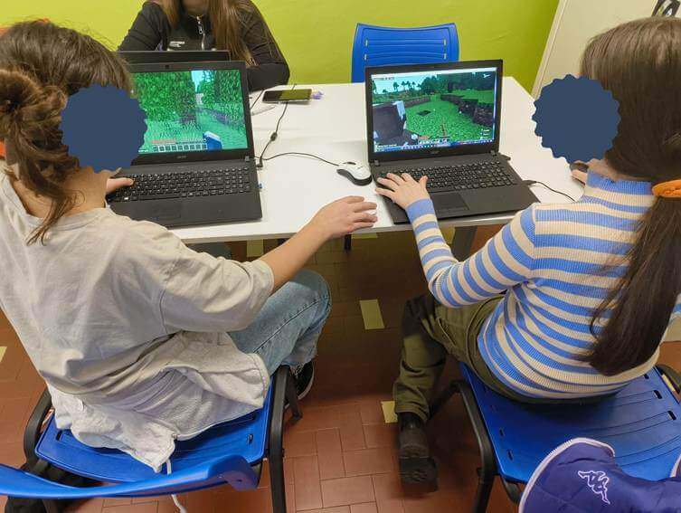 Foto 3. Lavoro di gruppo e condivisione delle strategie. Gruppo di studentesse che condivide idee e soluzioni davanti ai propri laptop, impegnandosi nella progettazione di un ambiente virtuale all’interno di Minecraft education. Il confronto tra pari è al centro dell’attività, dando vita a dinamiche di cooperazione, negoziazione e tutoring reciproco, in un clima motivante e costruttivo.