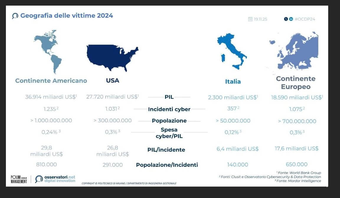 Si noti, da un lato, che il PIL italiano è circa un dodicesimo del PIL USA e circa un ottavo di quello europeo, mentre dall’altro abbiamo dal Politecnico di Milano il dato per cui la spesa in cybersecurity in Italia è di circa lo 0,12% del PIL.