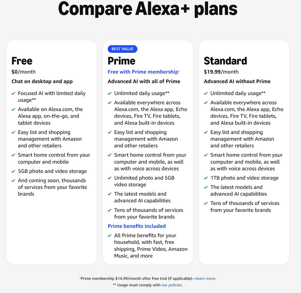 Pagando quasi 20$ al mese si ottiene la versione avanzata con un uso illimitato del modello e spazio cloud. È interessante osservare come, almeno per ora, se si dispone dell’abbonamento Prime il servizio sia incluso ad un prezzo inferiore: ergo Amazon vuole spingere gli utenti sul servizio prime piuttosto che vendere un servizio AI indipendente.