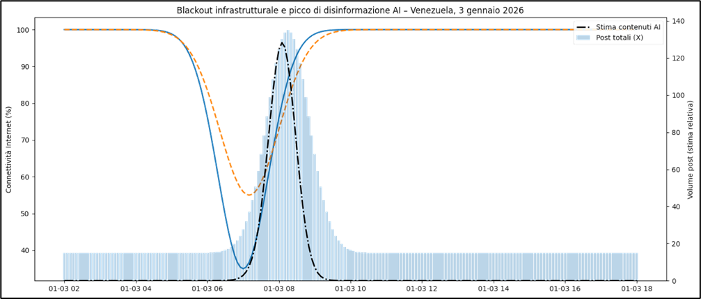 (Rielaborazione realizzata con l’utilizzo di dati pubblici di monitoraggio della connettività – NetBlocks, Cloudflare Radar – e su stime di volume informativo derivate da analisi di pattern di diffusione sui social. I contenuti AI-generated sono identificati su base probabilistica)