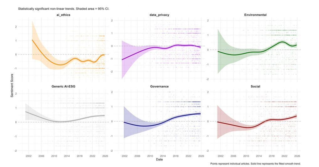 Figura 1 – Trend temporali del sentiment nei confronti dell’AI nei tre pilastri ESG e nei sotto-cluster dell’etica e della riservatezza dei dati. Adattamento da (Laviola & Cucari, 2026).