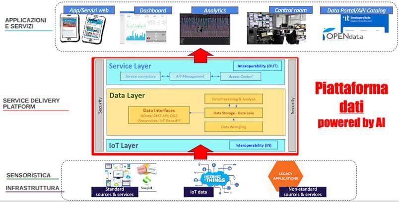 - Service delivery Platform: piattaforma per la delivery dei servizi, in grado di integrare, elaborare e valorizzare i dati raccolti al fine di migliorare i servizi esistenti e crearne di nuovi
