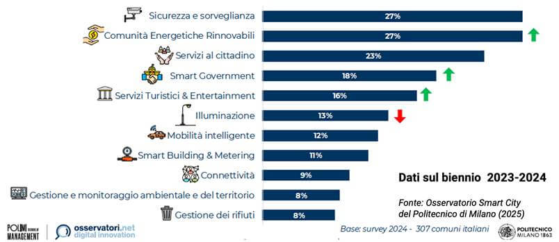 Osservando i dati relativi ai principali ambiti dei progetti smart avviati dai Comuni per il biennio 2023-2024 presentati dall’Osservatorio smart city del Politecnico di Milano troviamo:
