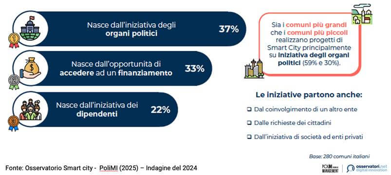 Ancora grazie ai risultati dell’indagine dell’Osservatorio smart city è emerso come la volontà di attivare progetti di smart city nasca prevalentemente dall’iniziativa degli organi politici (sia per i comuni più grandi: 59%, che per quelli più piccoli: 30%), oppure dalla possibilità di accedere a un finanziamento.