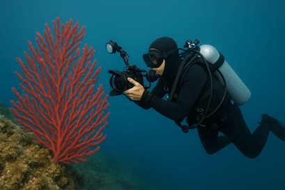 Nell’immagine un operatore subacqueo esegue delle riprese video ad una gorgonia rossa per eseguirne in seguito un’analisi fotogrammetrica. Si noti come l’obiettivo della macchina da presa sia perpendicolare al soggetto.